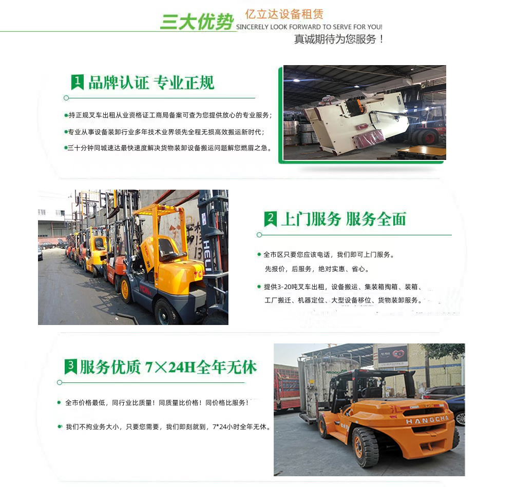 亿立达设备租赁有限公司是工商局准许的天津广播影视职业学院专业叉车出租公司,公司本着诚信、服务、效率、创新的经营理念,用精湛的技术,真诚的服务,为众多客户提供优质的服务,同时获得信赖与支持。专业提供天津广播影视职业学院3-20吨叉车出租、叉车租赁、设备搬运、集装箱掏箱装箱、机器移位定位、货物装卸、工厂搬迁、安全可靠,收费透明,价格便宜,随叫随到,24小时上门服务!本公司叉车吊车师傅对各种设备搬运装卸都有深刻探讨和研究。很多的疑难设备搬运,通过我公司的叉车师傅都能迎刃而解。对各种进口设备、国产机器、大型设备搬迁、高难度搬迁、各种精密仪器、医疗设备、科研设备等都能搬运; 提供全市 24 小时上门装卸搬运服务。同时提供厂房搬迁服务。 ...
